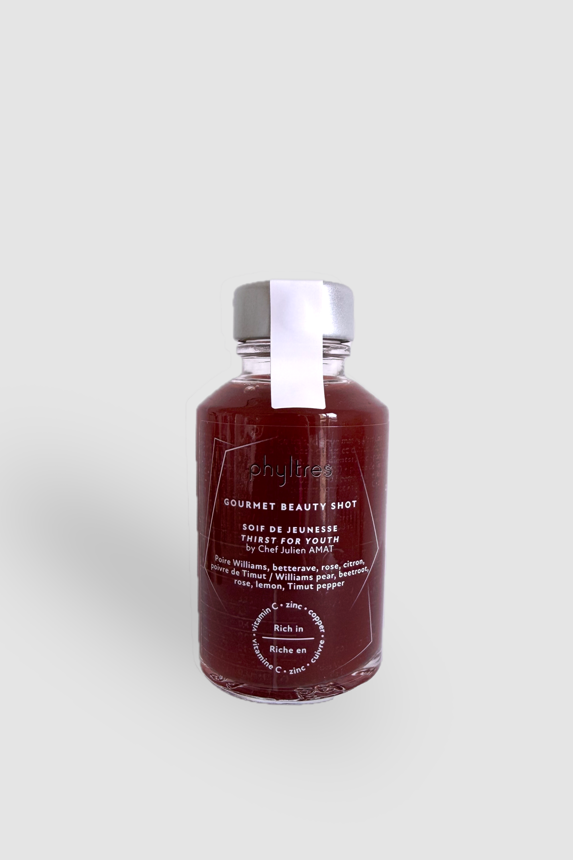 85% of consumers* noticed an improvement in their skin by the 5th day of the regimen.84% found the Thirst for Youth ritual more effective than their usual topical skincare.71% even considered adopting it in place of their current routine.100% are ready to repeat the regimen.92% would recommend it to others.Praised for their delicious taste, the shots have an aromatic intensity that awakens the senses. *Test conducted by an independent sensory analysis laboratory on a panel of 40 consumers, mostly aged between 30 and 59, from 9 to 30 May 2022. These participants followed a 7-day regimen at home to evaluate improvements in skin condition, overall satisfaction with the regimen, and the sensory characteristics of the shots.
